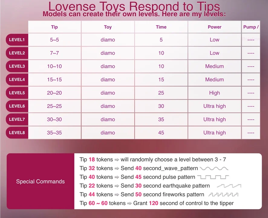 পুরুষাঙ্গের রেটিং, কক রিং, কামশট, ডার্টি টক, ফ্ল্যাশিং, ফ্লেক্সিং, ফুট ফেটিশ, হস্তমৈথুনের নির্দেশিকা, ম্যাসেজ, হস্তমৈথুন, ধূমপান, যোগা, অ্যানাল, ব্লোজব, কাম প্লে, ডিলডো বা ভাইব্রেটর, বীর্যপাত, ফেসিয়াল, ফিঙ্গারিং, গ্যাগিং, হ্যান্ডজব, অয়েল শো, অর্গাজম, পুসি লিকিং, সেক্স টয়, শাওয়ার, স্ট্রিপটিজ, অ্যানাল টয়, ক্রিমপাই, ডগি স্টাইল, ইরোটিক ড্যান্স, আউটডোর, রোল প্লে, স্প্যাঙ্কিং